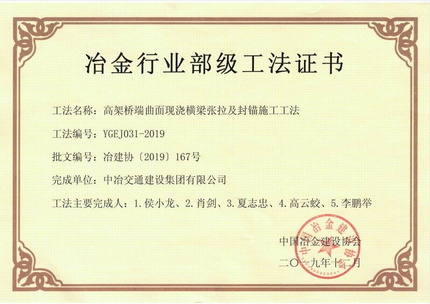 2019年高架橋端曲面現(xiàn)澆橫梁張拉及封錨施工工法證書