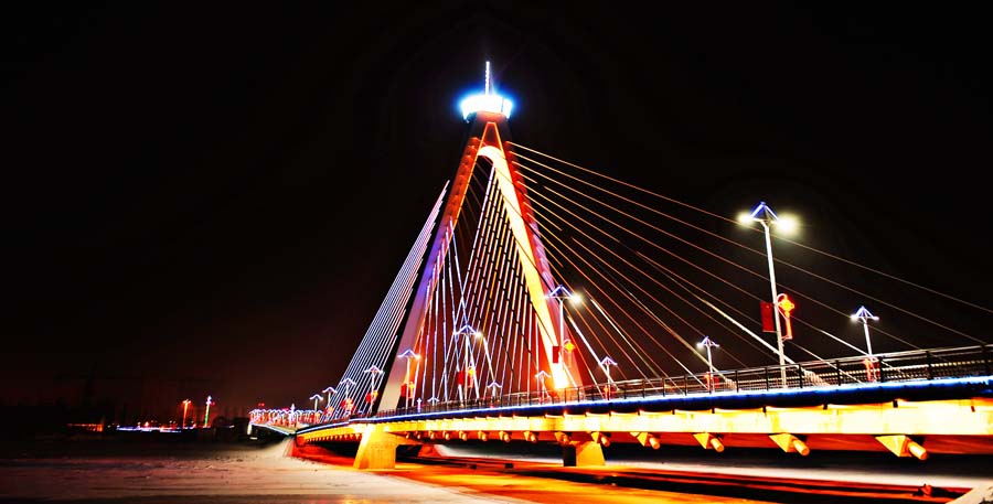 內(nèi)蒙古珠斯花大街跨霍林河斜拉橋是通遼市首座斜拉橋項目,全長200米,最大跨徑100米,為單塔雙索面斜拉橋,該項目采用BT方式承建。